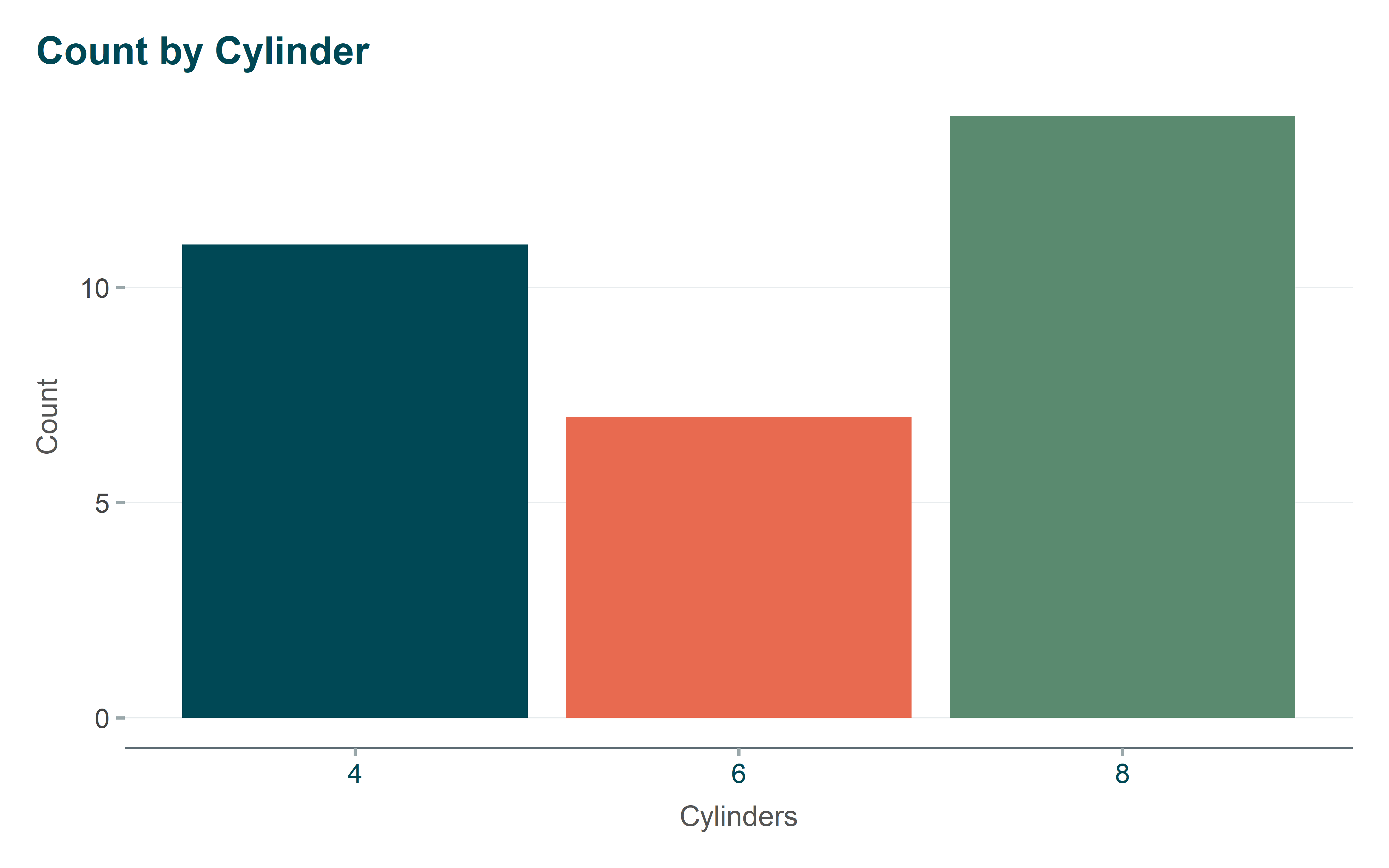 ggplot(mtcars, aes(x =factor(cyl), fill =factor(cyl))) +geom_bar() +scale_fill_cpal("main") +# Use cpal_colors("main", n = 3) for fewer colorslabs(title ="Count by Cylinder", x ="Cylinders", y ="Count") +theme_cpal() +theme(legend.position ="none")