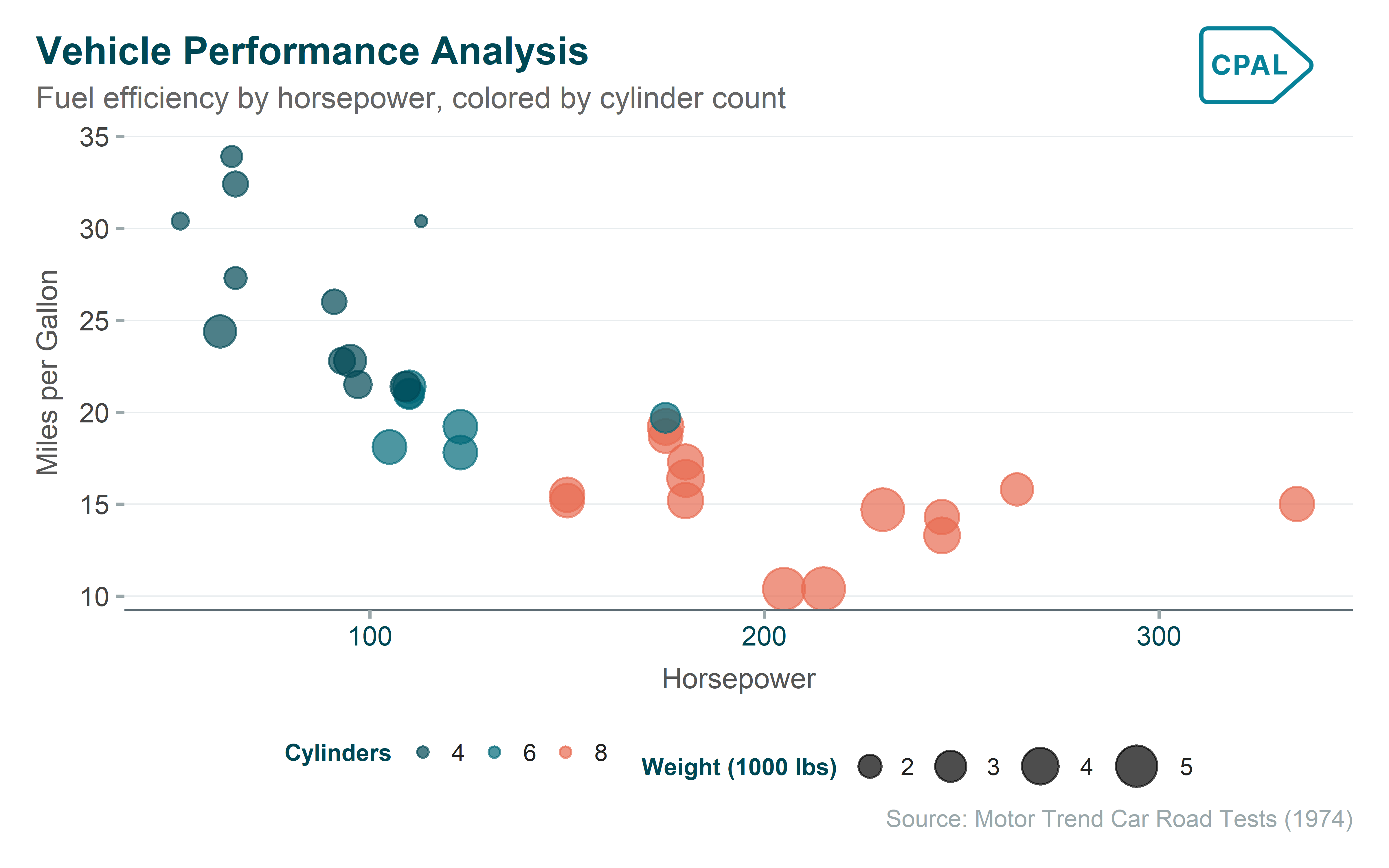 # Prepare datacar_data <- mtcars |>mutate(cylinders =factor(cyl),efficiency =ifelse(mpg >median(mpg), "High", "Low") )# Create visualizationp1 <-ggplot(car_data, aes(x = hp, y = mpg, color = cylinders, size = wt)) +geom_point(alpha =0.7) +scale_color_cpal("main_3") +scale_size_continuous(range =c(2, 8)) +labs(title ="Vehicle Performance Analysis",subtitle ="Fuel efficiency by horsepower, colored by cylinder count",x ="Horsepower",y ="Miles per Gallon",color ="Cylinders",size ="Weight (1000 lbs)",caption ="Source: Motor Trend Car Road Tests (1974)" ) +theme_cpal()cpaltemplates::add_cpal_logo(p1)