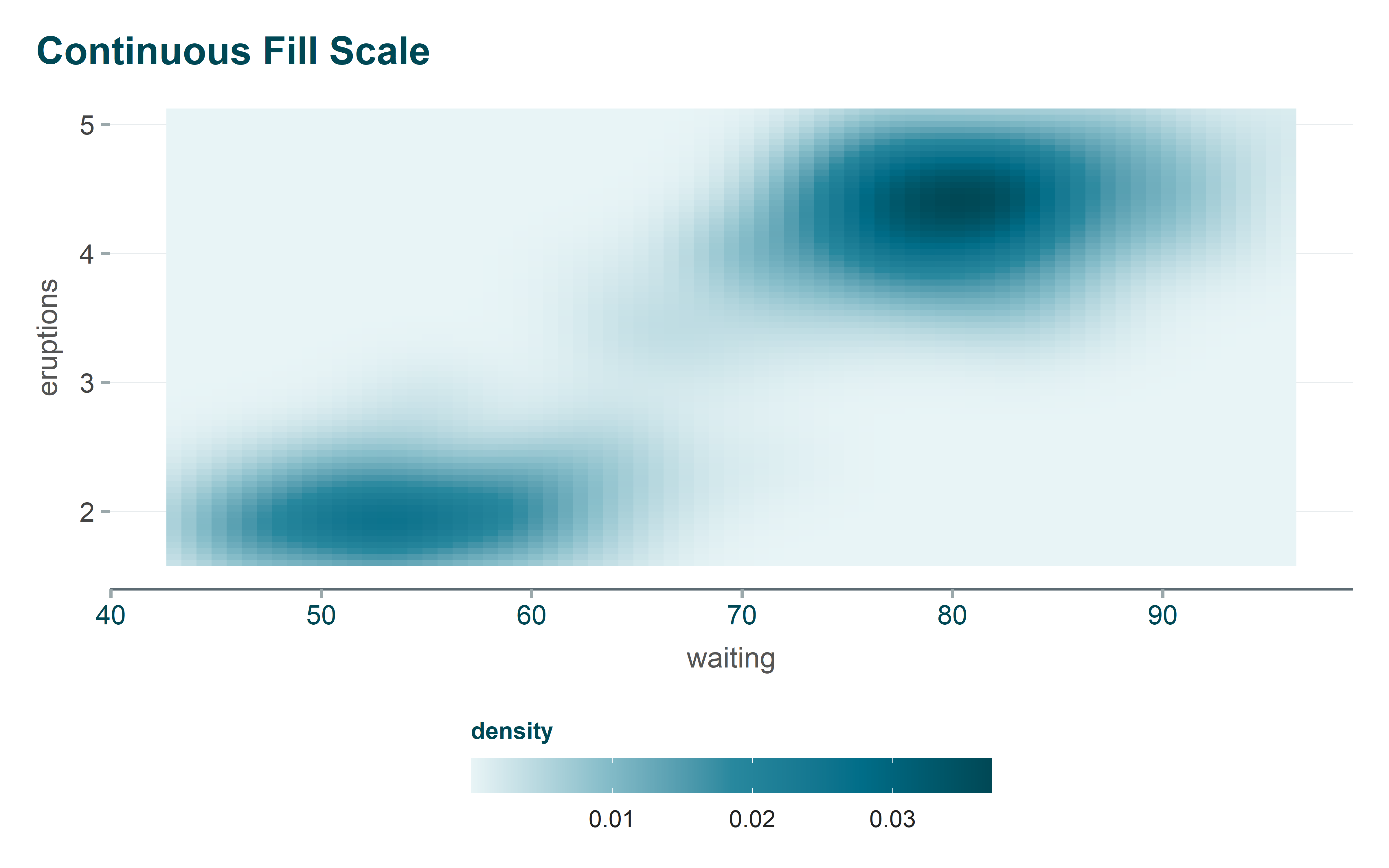 ggplot(faithfuld, aes(waiting, eruptions, fill = density)) +geom_tile() +scale_fill_cpal_c("midnight_seq_5") +labs(title ="Continuous Fill Scale") +guides(fill =guide_colorbar(title.position ="top",barwidth =15,barheight =1 )) +theme_cpal()