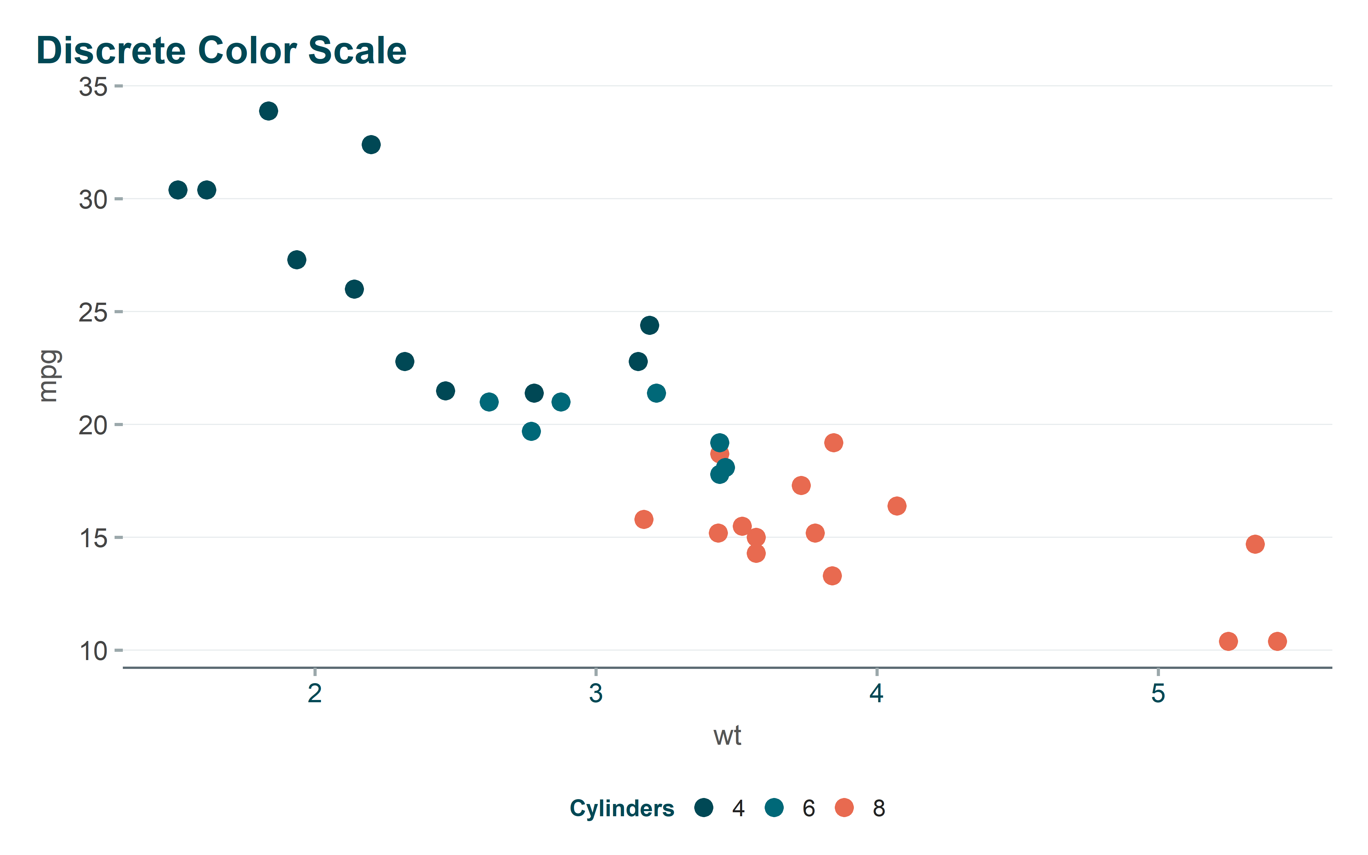ggplot(mtcars, aes(x = wt, y = mpg, color =factor(cyl))) +geom_point(size =3) +scale_color_cpal("main_3") +labs(title ="Discrete Color Scale",color ="Cylinders" ) +theme_cpal()