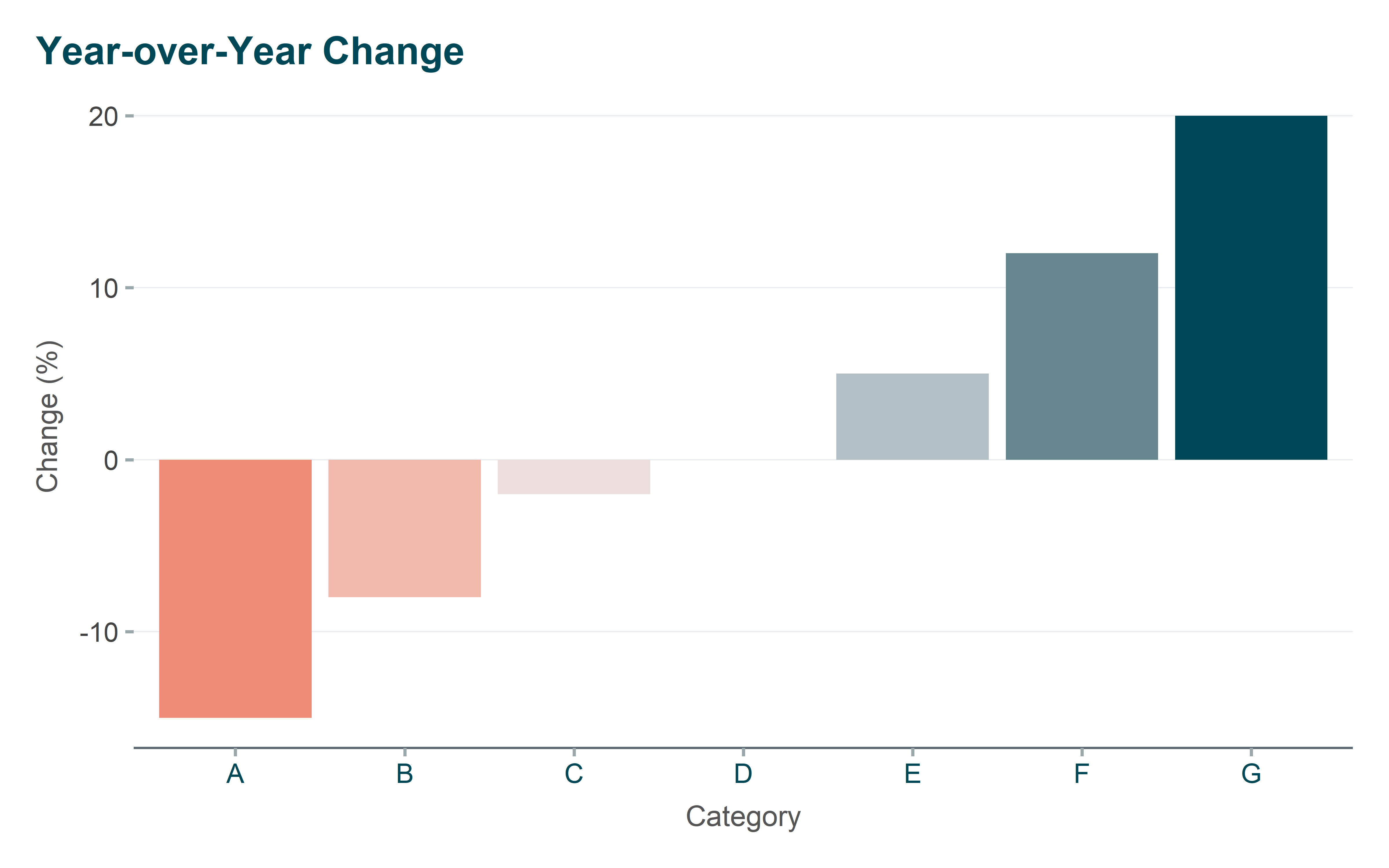 # Create sample data with positive and negative changeschange_data <-data.frame(category = LETTERS[1:7],change =c(-15, -8, -2, 0, 5, 12, 20))ggplot(change_data, aes(x = category, y = change, fill = change)) +geom_col() +scale_fill_gradient2(low ="#E86A50",mid ="#E8ECEE",high ="#004855",midpoint =0 ) +labs(title ="Year-over-Year Change",x ="Category",y ="Change (%)" ) +theme_cpal() +theme(legend.position ="none")