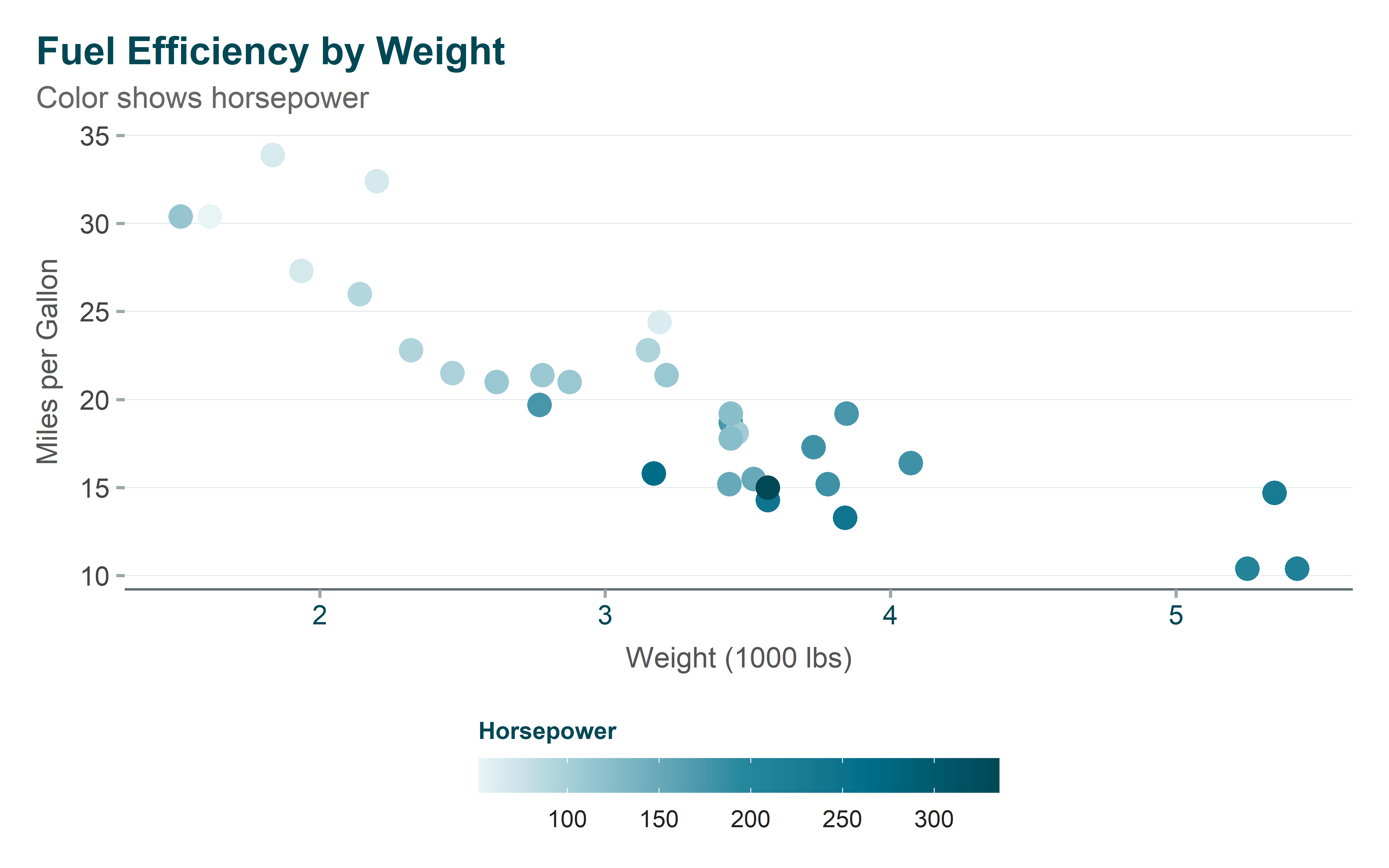 ggplot(mtcars, aes(x = wt, y = mpg, color = hp)) +geom_point(size =4) +scale_color_cpal_c("midnight_seq_5") +labs(title ="Fuel Efficiency by Weight",subtitle ="Color shows horsepower",x ="Weight (1000 lbs)",y ="Miles per Gallon",color ="Horsepower" ) +guides(color =guide_colorbar(title.position ="top",barwidth =15,barheight =1 )) +theme_cpal()